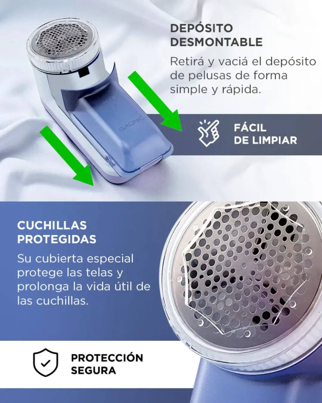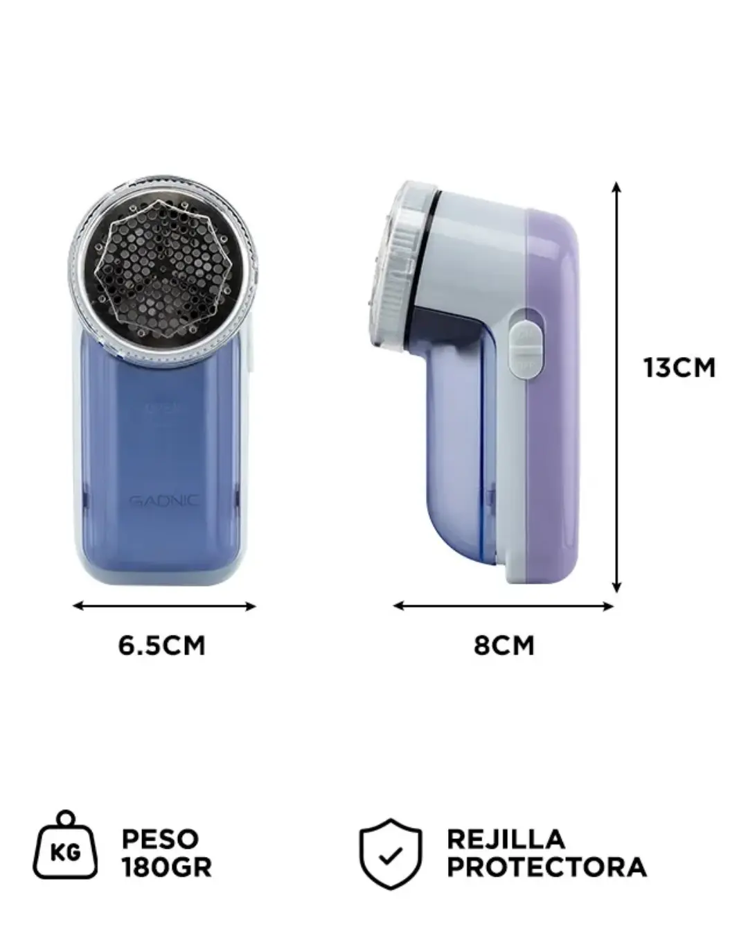 El eliminador de pelusas de tela está diseñado con una cubierta protectora de plástico para cubrir la hoja y la malla de acero inoxidable, evitando daños innecesarios en su tela.